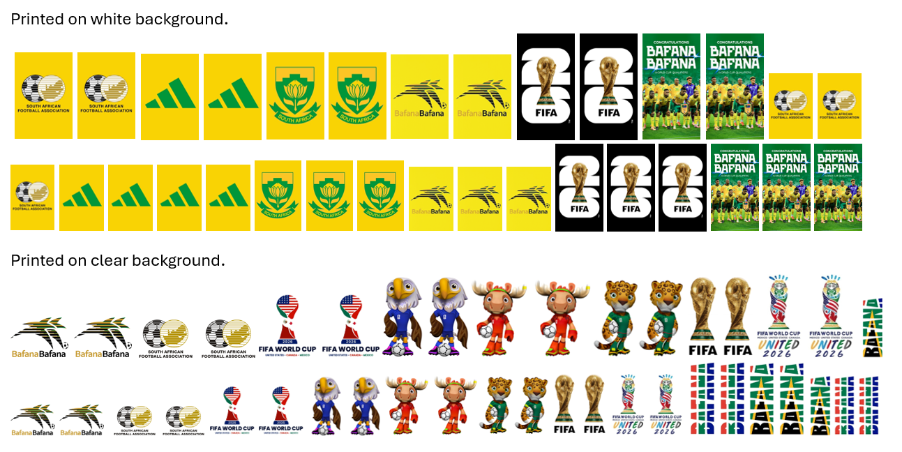 Solid colour prints on white background and the other pictures on clear background as in the images.